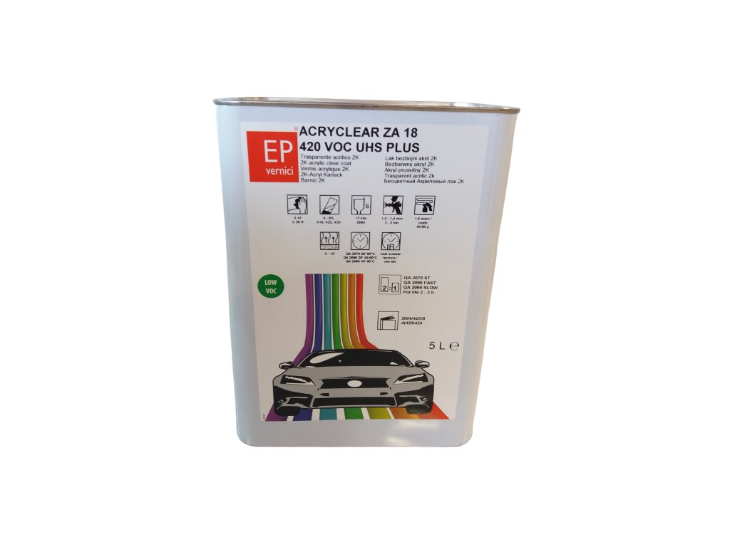EP VERNICI 2K UHS Clearcoat je lak novej generácie, ktorý sa vyznačuje vysokou hustotou, nízkym obsahom rozpúšťadiel a nízkym obsahom VOC. Používa sa na bodové aj celoplošné lakovanie osobných a úžitkových vozidiel. Má vynikajúcu odolnosť voči všetkým klimatickým vplyvom, vynikajúcu chemickú a mechanickú odolnosť. Ľahko sa leští. Spotreba: 10 - 12 m2/l. - Riedenie akrylovým riedidlom EP VERNICI - Tvrdnutie 2:1 (50 % so štandardným alebo rýchlym tvrdidlom EP VERNICI) - Rozprašovacia dýza 1,3 - 1,4 mm pri tlaku 2 - 3 bar - 1,5 vrstvy 40-50 mikrónov EP VERNICI je talianska značka s dlhoročnou tradíciou od roku 1964, ktorá sa venuje výrobe materiálov pre autolakovne. Ich sortiment zahŕňa odmasťovače, antikorózne základné nátery, plnivá, konštrukčné farby, riedidlá, laky a mnoho ďalšieho.Dodatočné parametre
