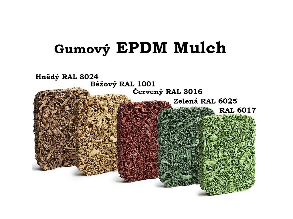 EPDM mulč je odolný, farebne stály a bezpečný gumový povrch vyrobený z recyklovaných pneumatík. Mulč EPDM je 100 % farbený, čo znamená, že si zachováva svoju farbu a je šetrný k životnému prostrediu a zdraviu. Vyberte si z 8 elegantných farieb.Detské ihriská, chodníky, bazény a iné typy vonkajších plôch - všetky tieto plochy a mnohé ďalšie možno pokryť farebným mulčovaním EPDM s PU spojivom, ktoré sa vyrába z drvených pneumatík.