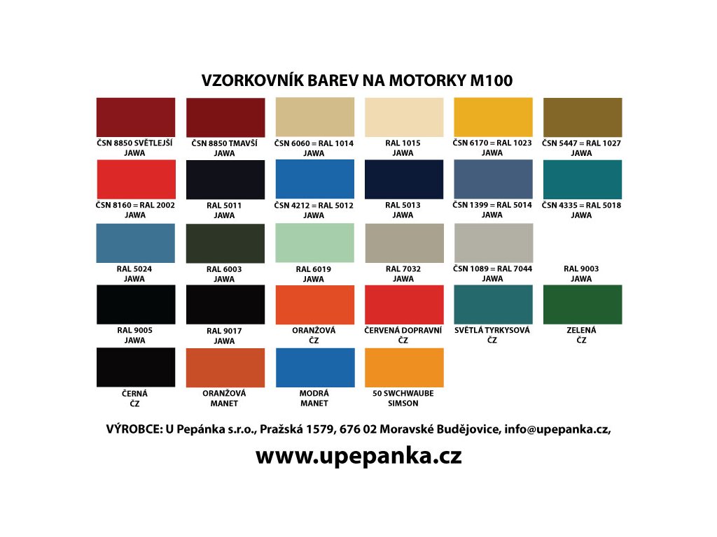 Originálna akrylová farba na motocykle ČZ z materiálu UHS (Ultra Hight Solid) vhodná pre historické automobily, osobné vozidlá a motocykle. Farba sa vyznačuje vysokou kvalitou krycej schopnosti a výťažnosti. Túto farbu dodávame ako sadu s tvrdidlom. Označenie materiálu M100. Vyznačuje sa jednoduchou aplikáciou a vynikajúcou krycou schopnosťou.ZOBRAZENÉ ODTIENE SÚ LEN ORIENTAČNÉ, ĎAKUJEME ZA POCHOPENIE!