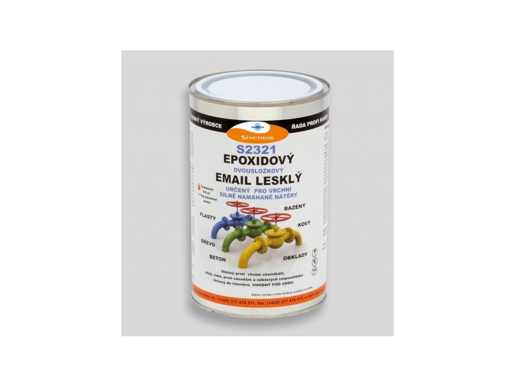 Dvojzložkový epoxidový vrchný náter na lesklé nátery kovov, betónu, stavebných materiálov, dreva, plastov, lisovaných materiálov atď. Odolný voči účinkom rôznych chemikálií, olejov, tukov, zásad a niektorých rozpúšťadiel. Vo verzii LESK. Vhodné aj do kúpeľa.Epoxidový email S 2321 odtieň biely je schválený na nátery povrchov, ktoré prichádzajú do priameho kontaktu s pitnou vodou, potravinami a potravinárskymi výrobkami. Epoxidový email S 2321 je vhodný na ochranu povrchu na pracoviskách s otvorenými zdrojmi ionizujúceho žiarenia (overovanie dekontaminácie).
