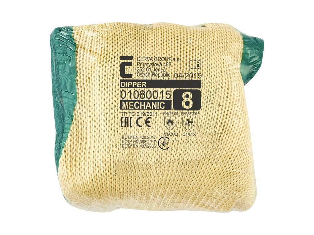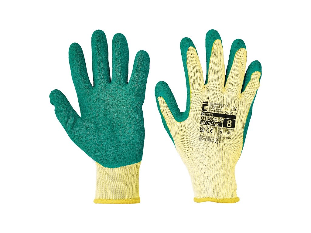 Pletené bezšvové nylonové rukavice DIPPER polomáčané v latexe. Vytvorená protišmyková úprava v dlani a na prstoch, elastická náplasť na zápästí. Ďalšie veľkosti v našej ponuke. Veľkosť 8" v zelenej farbe, veľkosť 9" a 10" v šedej farbe.Dodatočné parametre