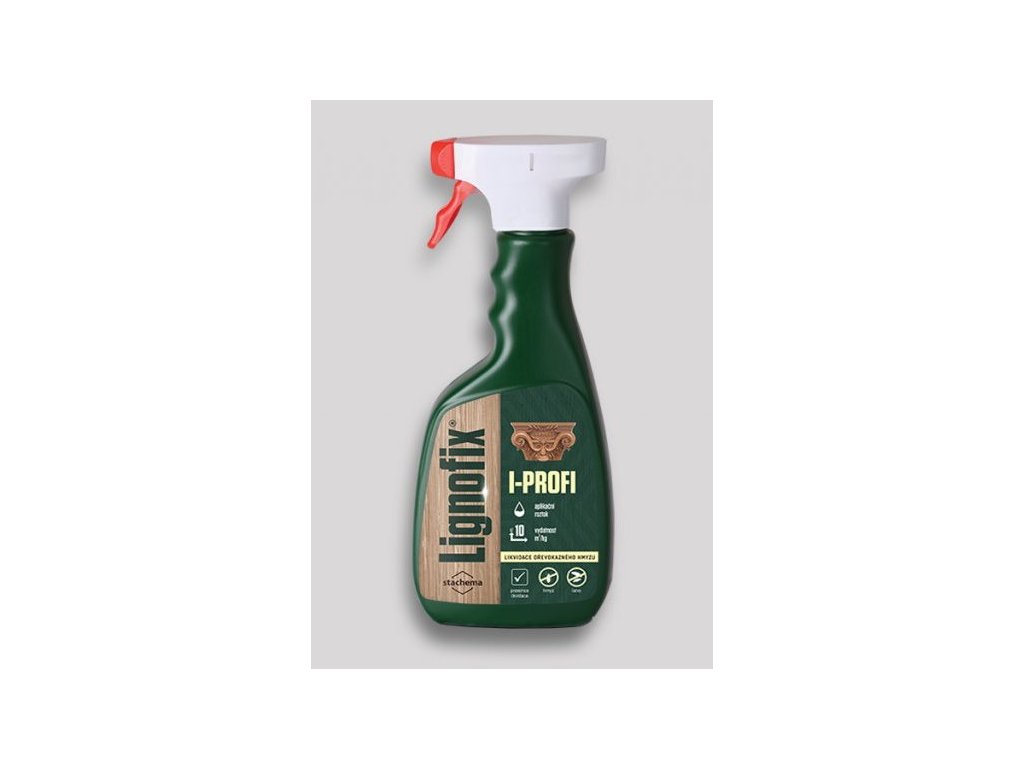 Prípravok je určený na likvidáciu drevokazného hmyzu Lignofix I-PROFI je tekutý prípravok na ošetrenie dreva napadnutého drevokazným hmyzom (drevokazný hmyz, tesársky chrobák a pod.) a na preventívne ošetrenie dreva proti drevokaznému hmyzu v interiéroch (strešné konštrukcie, obloženia, schody, podlahy a pod.) a v exteriéroch bez priameho a trvalého kontaktu so zemou (strešné podhľady, drevené stavby, ploty, krovy a pod.). Nesmie sa používať na drevo, ktoré prichádza do priameho kontaktu s potravinami, nápojmi a krmivami, ani na ošetrenie dreva určeného na výrobu detského nábytku a hračiek. Aplikačný roztok v rozprašovači. Používajte biocídne prípravky bezpečne. Pred použitím si vždy prečítajte informácie na obale. - Veľkosť 500 gDodatočné parametre