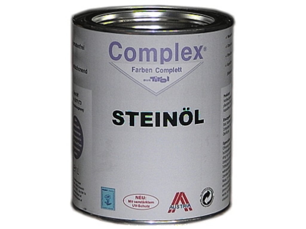 Zmes tvrdých olejov na báze rastlinných olejov, balzamov, tvrdých voskov, parafínov, bez olovnatých látok, ktoré sa počas sušenia odparujú.SteinÖl možno použiť na kameň, prírodný kameň, tehly, dlaždice, mramor alebo podobné materiály. Vďaka otvoreným pórom zaručuje SteinÖl odolnosť voči vode a oderu. Preniká hlboko do pórov materiálu a posilňuje ho. Vďaka tomu si vždy zachováva svoju pevnosť a svieži vzhľad. Je tiež odolný voči vínu, pivu, limonáde, káve, čaju, ovocným šťavám, mlieku, UV žiareniu a poveternostným vplyvom. Z povrchu materiálu čo najskôr odstráňte ostatné chemikálie.Po vytvrdnutí je fyziologicky neškodný.Poznámka: COMPLEX-STEINÖL je lepšie spracovateľný, ak sa pred použitím pretrepe a premieša. Nanáša sa v tenkých vrstvách, na natretých plochách nesmie zostať prebytočný olej, zvyšky neabsorbovaného oleja sa musia odstrániť, inak vznikajú matné a lesklé miesta.