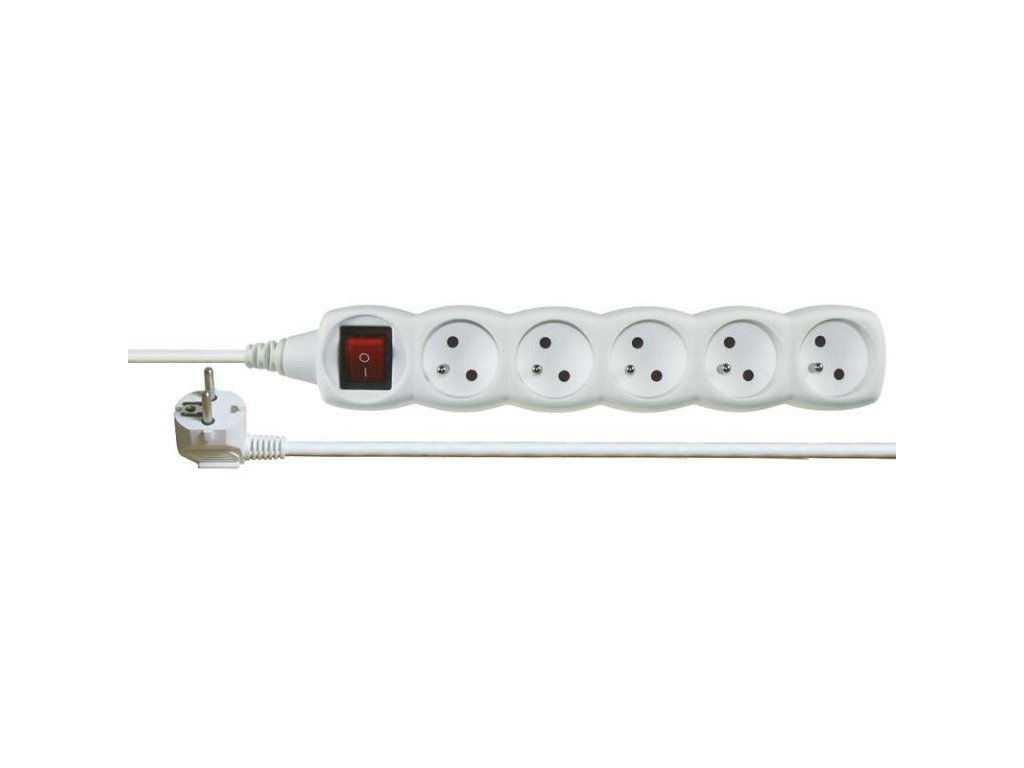 Biely predlžovací kábel, 5 zásuviek s vypínačom, dĺžka podľa aktuálnej ponuky s prierezom vodiča 1 mm2. Vhodné pre maximálne zaťaženie 10 A max. Predlžovací kábel 230 VAC sa používa na predĺženie napájania tam, kam pevná zásuvka nedosiahne.- Veľkosť označuje dĺžku prívodného kábla - napr. 3m označuje dĺžku 3 metre
