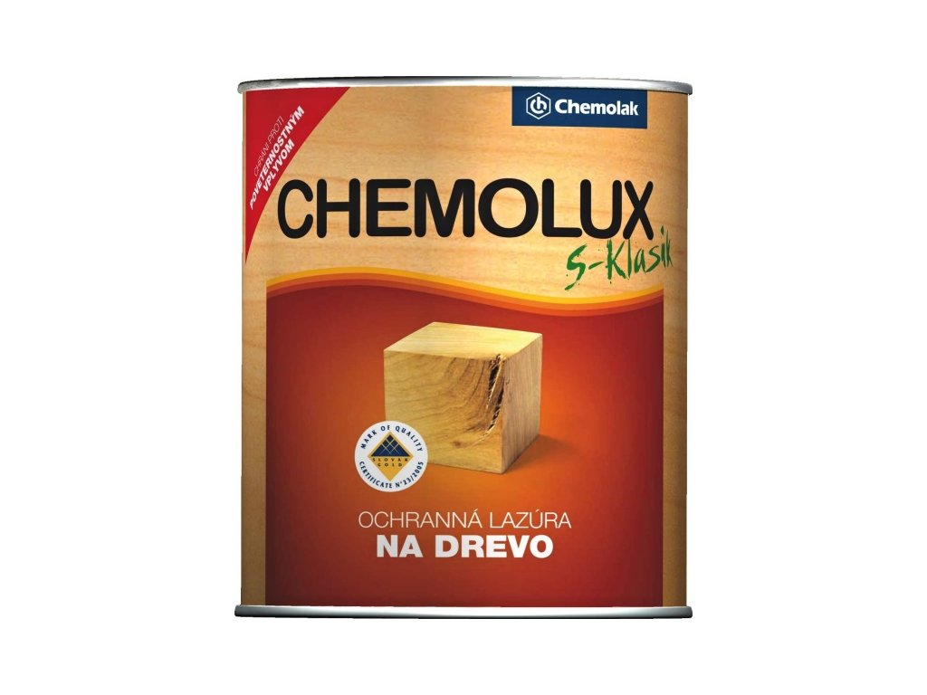 Rozpúšťací lak na povrchovú úpravu dreva na vonkajšie a vnútorné použitie, nátery chát, okien, podláh, plotov atď. Má dobrú odolnosť voči poveternostným vplyvom. Jeho vodoodpudivé vlastnosti zvyšujú rozmerovú stabilitu dreva, špeciálne pigmenty a prísady znižujú vplyv UV žiarenia, a tým zabraňujú fyzikálno-chemickej degradácii drevnej hmoty. CHEMOLUX S - Klasik farbí drevo a zvýrazňuje jeho prirodzenú krásu. Nepoužívajte na nátery, ktoré prichádzajú do styku s potravinami, krmivami, pitnou vodou, na nátery detského nábytku a hračiek.Farebné odtiene