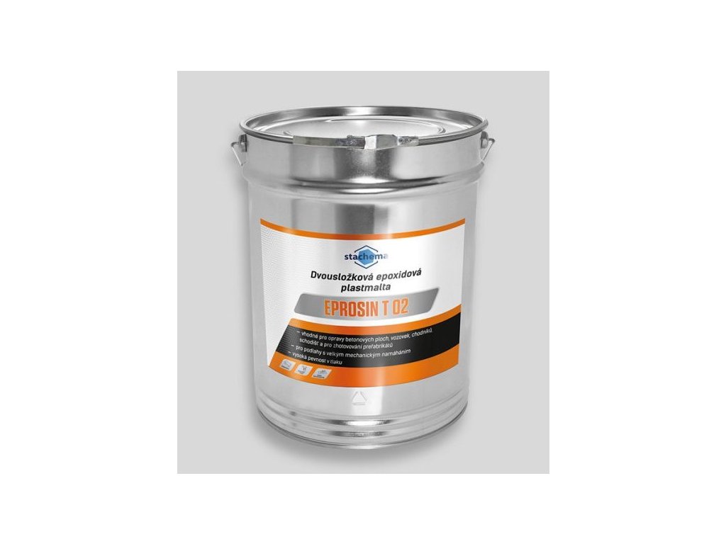 EPROSIN T02 casting - Sivá dvojzložková epoxidová plastická malta, ktorá sa dodáva v sade s tvrdidlom (zložka A + zložka B). Pomer zložiek v súbore zodpovedá pomeru trenia. Používa sa v stavebníctve ako liata plastická malta na liatie betónových povrchov a vozoviek, mostných ložísk, pätiek zábradlí, muriva, betónových dlažieb, na zhotovovanie betónových prefabrikátov a podláh s vysokým mechanickým namáhaním atď. Tesniaca hmota ani vytvrdnutá zmes sa pred použitím neriedia.VLASTNOSTI: Vzhľad: sivá tekutá hmota Sypná hmotnosť: ? 1850 kg/m3 Pevnosť v tlaku po 24 hodinách: ? 60 MPa (pri + 20 °C) Pevnosť v tlaku po úplnom vytvrdnutí: ? 85 MPa (pri + 20 °C) Elektrická odolnosť: ? 20 G? Priľnavosť k podkladu: ? 3 MPa (porušenie v betóne) Odolnosť voči chemickým rozmrazovacím prostriedkom: 0 g/m2 po 150 cykloch (metóda C) Bez zápachu. Žiadne zmrštenie.