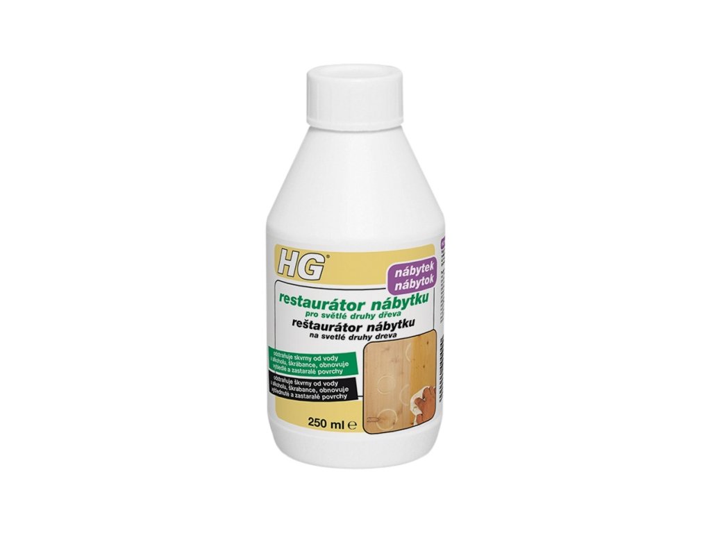 Účinný reštaurátor, ktorý dokonale vyčistí drevený nábytok. Vhodné na lakované, morené, voskované a neošetrené drevo.Reštaurátor na nábytok HG na tmavé drevo je vysokokvalitný prípravok na morený, lakovaný, olejovaný, voskovaný alebo neošetrený nábytok. Zmiznú škvrny od tekutín, ako sú vodné a alkoholové krúžky, zašednuté a vyblednuté povrchy získajú späť svoju prirodzenú farbu a škrabance sa zamaskujú. Návod na použitie: Aplikujte hojne v pravidelných pruhoch a nechajte pôsobiť 6-10 hodín. Aplikáciu opakujte na miestach, kde sa prípravok úplne vstrebal. Po uplynutí doby aplikácie odstráňte prebytočný materiál čistou handričkou.Dodatočné parametre
